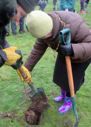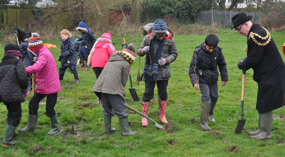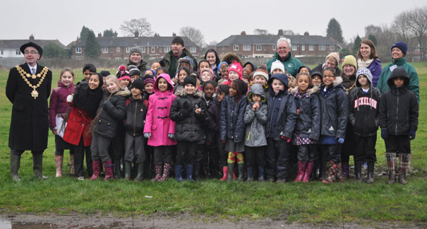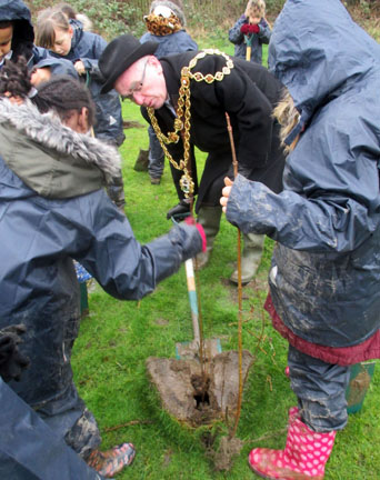 Children from The Oval School and Blakenhale School are joined by the Lord Mayor of Birmingham Councilor Mike Leddy & The Lady Mayoress Mrs Pauline Leddy, Tree Planting at Yardley Old Park.